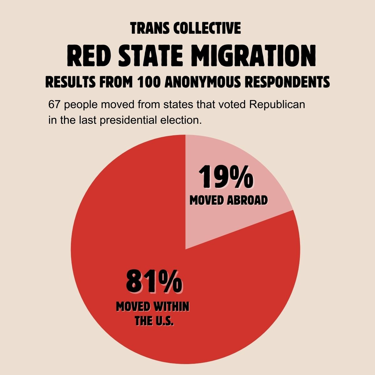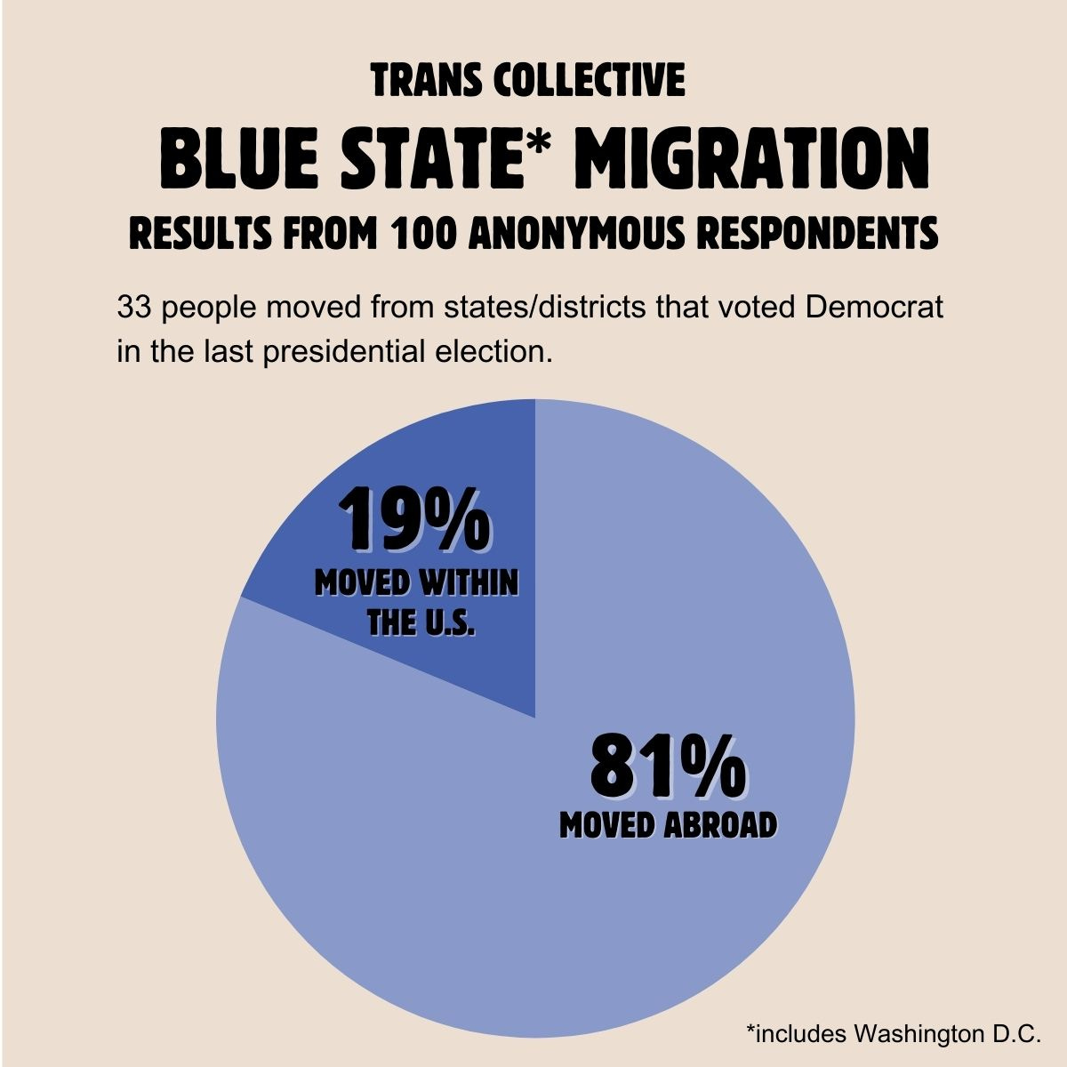 Overall, 81% of trans people who left blue states moved abroad, while 19% moved within the United States. The majority of people moving in the U.S. moved to another blue state. Only 3 people moved from a blue state to a red state.