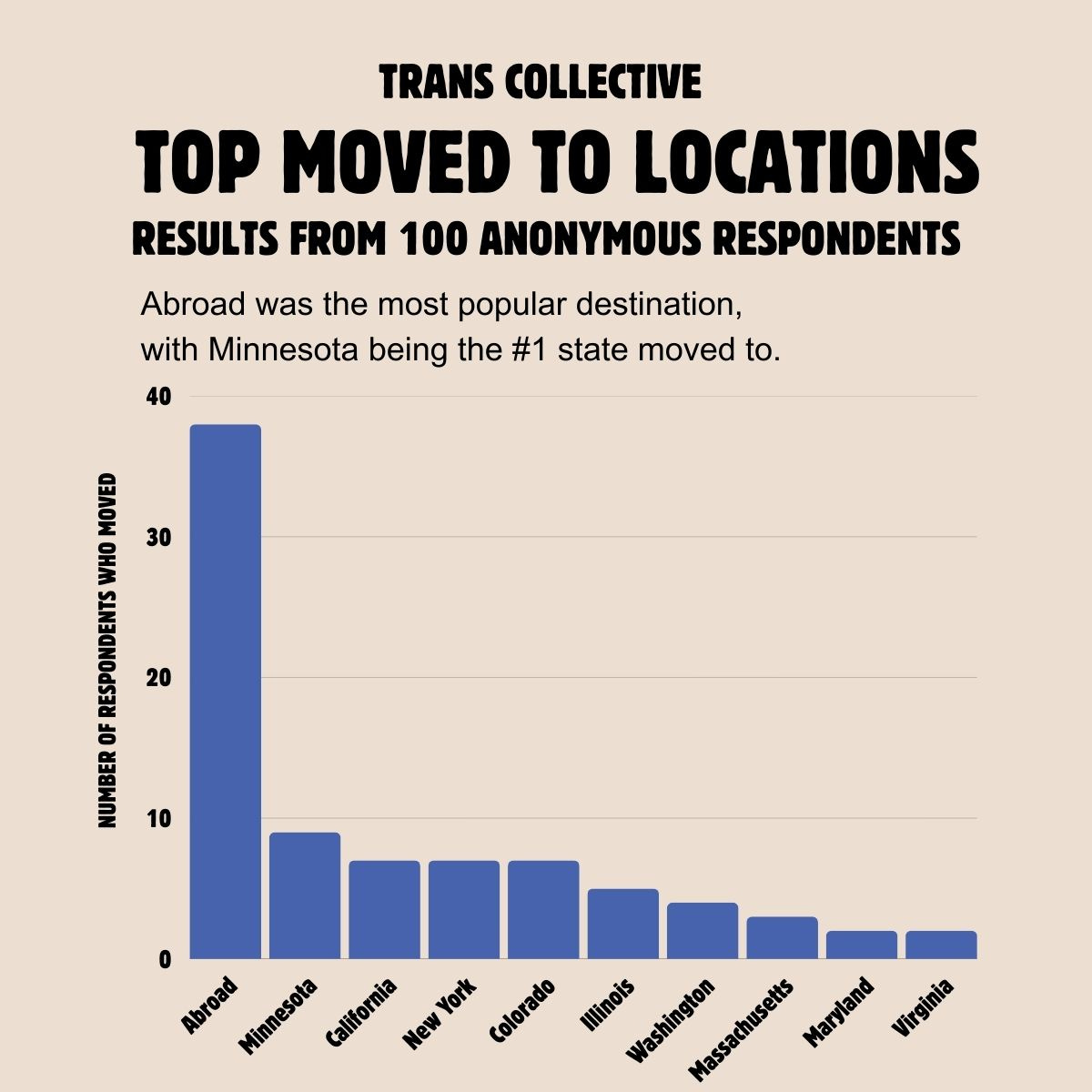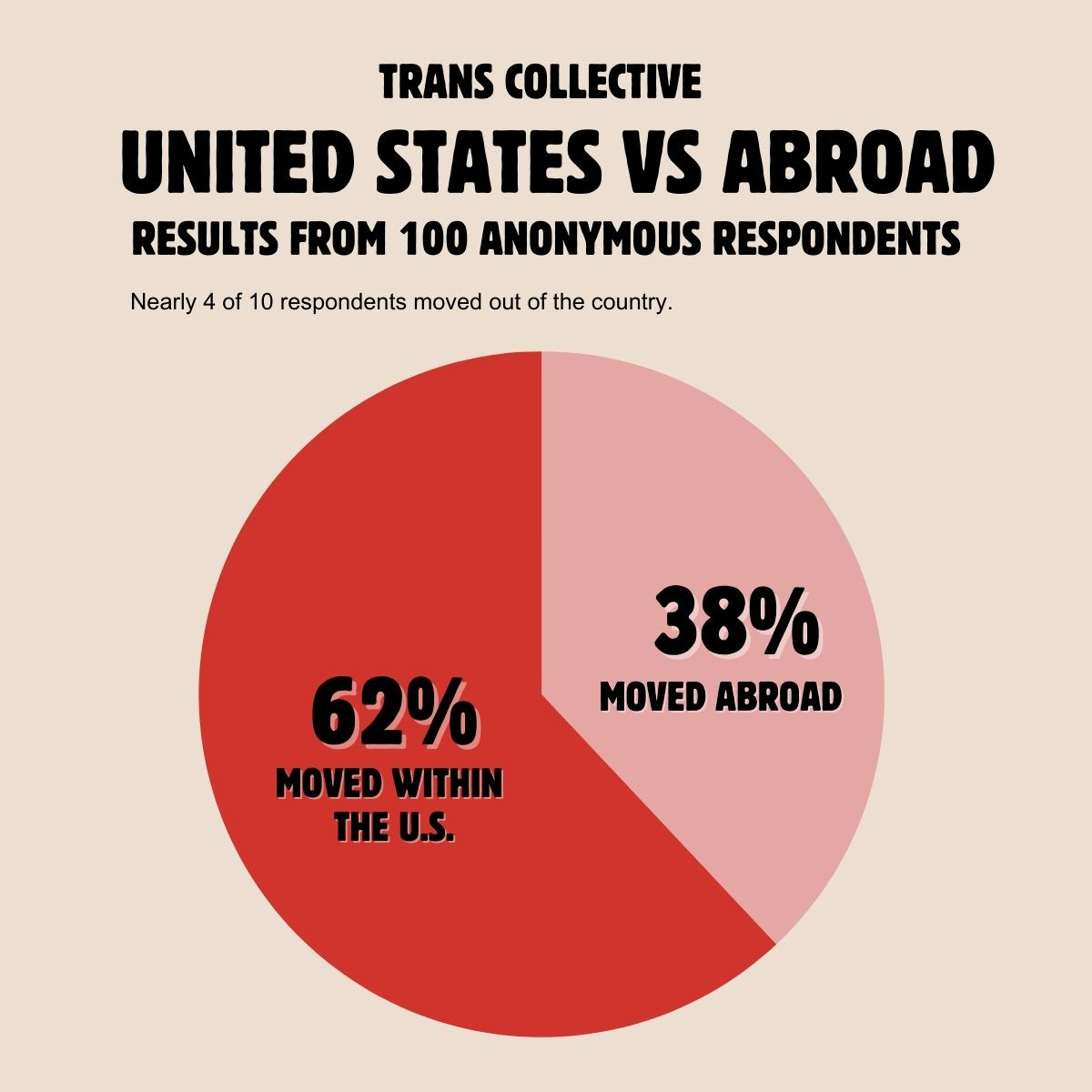 The Trans Collective Migration map was created using anonymous data submitted via a Google Form. This dataset represents 100 individuals. Red states are states that voted Republican, and blue states are states that voted Democratic in the 2024 presidential election. 38 of 100 people moved abroad.